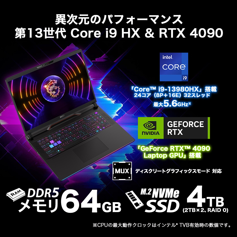 MSI(エムエスアイ) Raider-GE78HX-13VI-321JP ゲーミングノートパソコン Raider GE78 HX 13V コアブラック [17.0型 /Windows11 Pro /intel Core i9 /メモリ:64GB /SSD:4TB /無し /日本語版キーボード /2023年2月モデル]