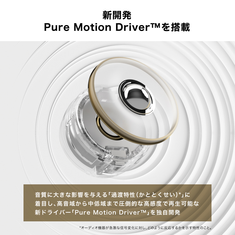 私たちは「過渡特性」に着目し、高音域から中低域まで圧倒的な高感度で再生可能な新ドライバー「Pure Motion Driver」を開発しました。全てを描き出す解像度の高い表現力により、アーティストやクリエーターの伝えたい音や人の想いを、余すことなく体感することができます。