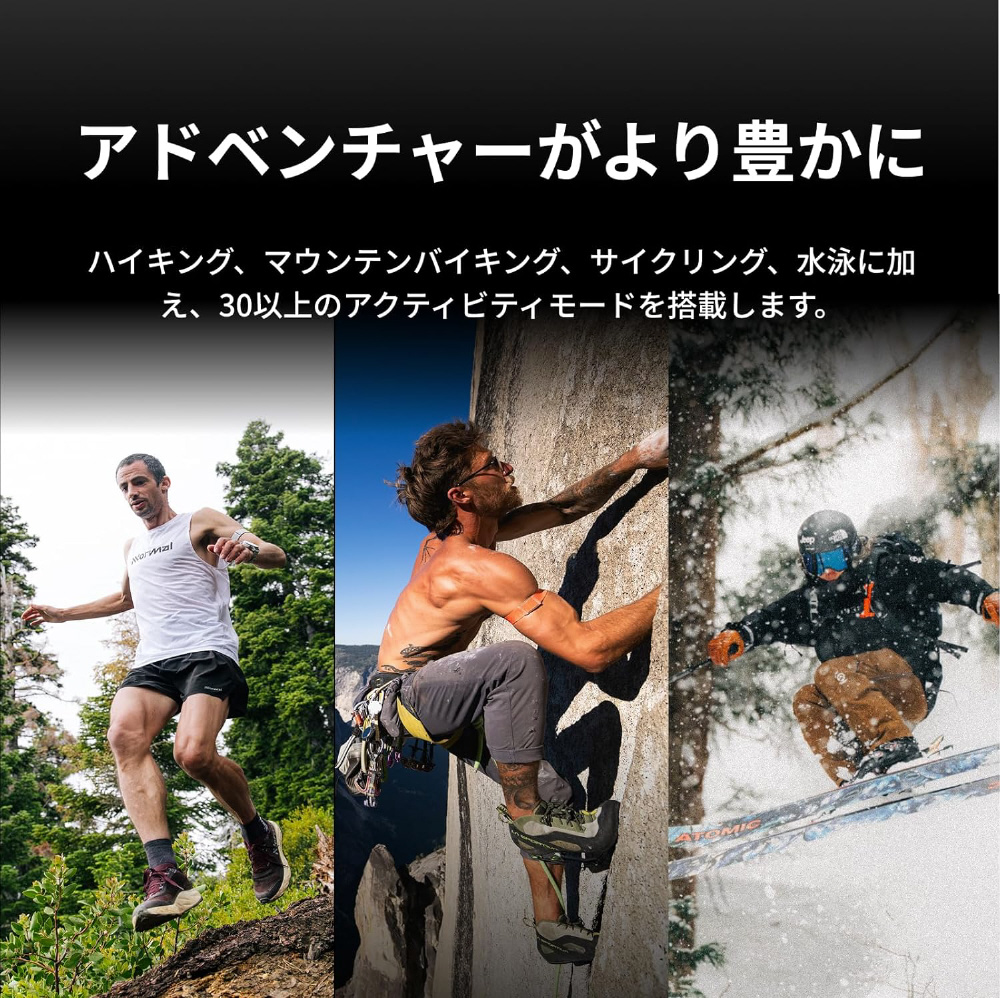 | 連続使用時間 | ■長時間モード全システムオン(GPS、GLONASS、Galileo、Beidou、QZSS):41時間、11時間(オフライン音楽)、■全システムオン(GPS、GLONASS、Galileo、Beidou、QZSS):34時間、10時間(オフライン音楽)、■二周波オン(GPS、GLONASS、Galileo、Beidou、QZSS):26時間、9時間(オフライン音楽)、■日常使用:15日間、(ストレス計測含む) |