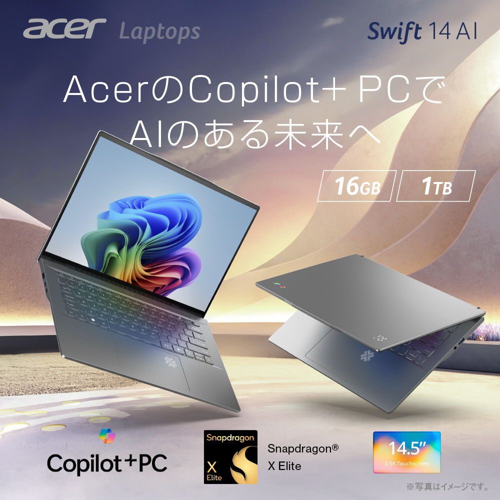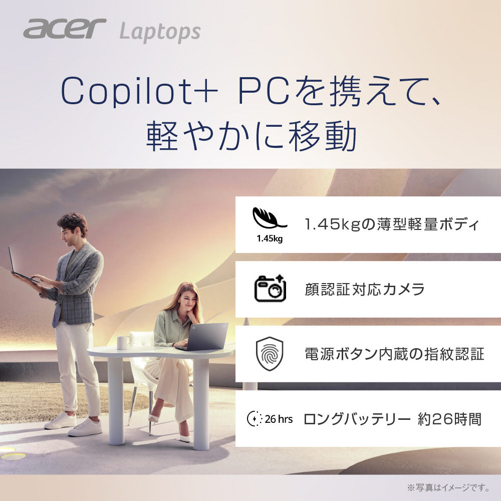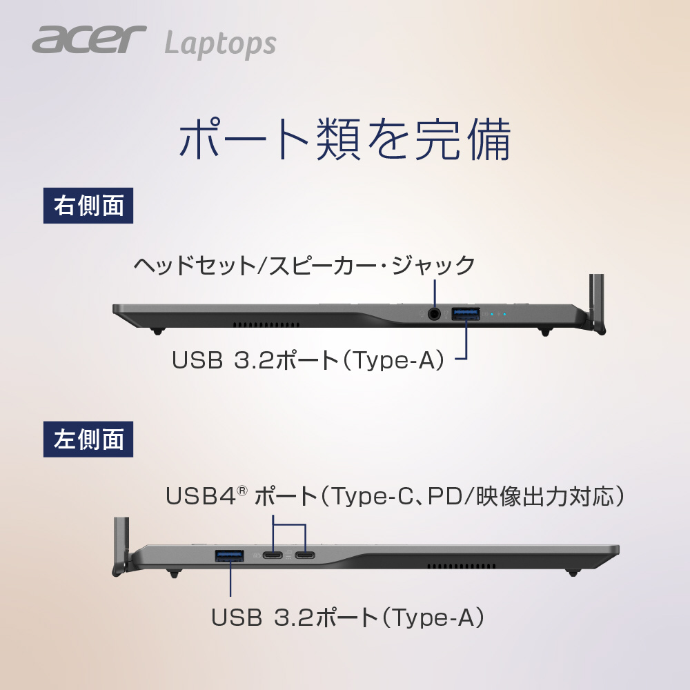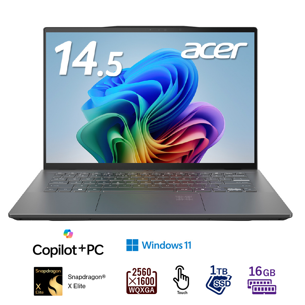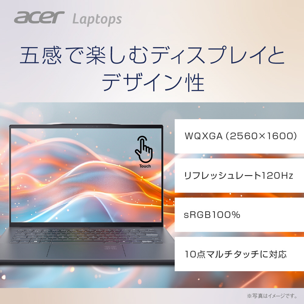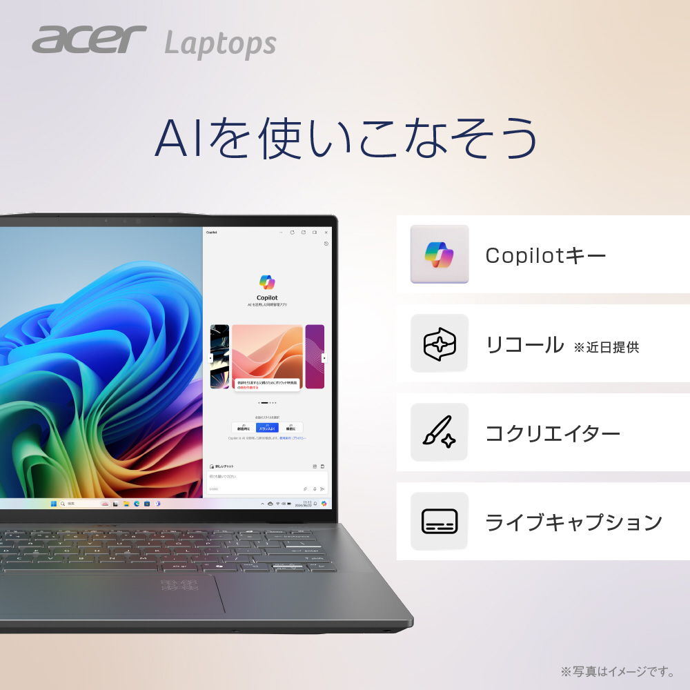 | 入力装置 | Acer FineTipバックライト付きキーボード(84キー/日本語/Copilotキー搭載)、Corning Gorilla Glass マルチジェスチャー・タッチパッド(アクティビティーインジケーター搭載) |