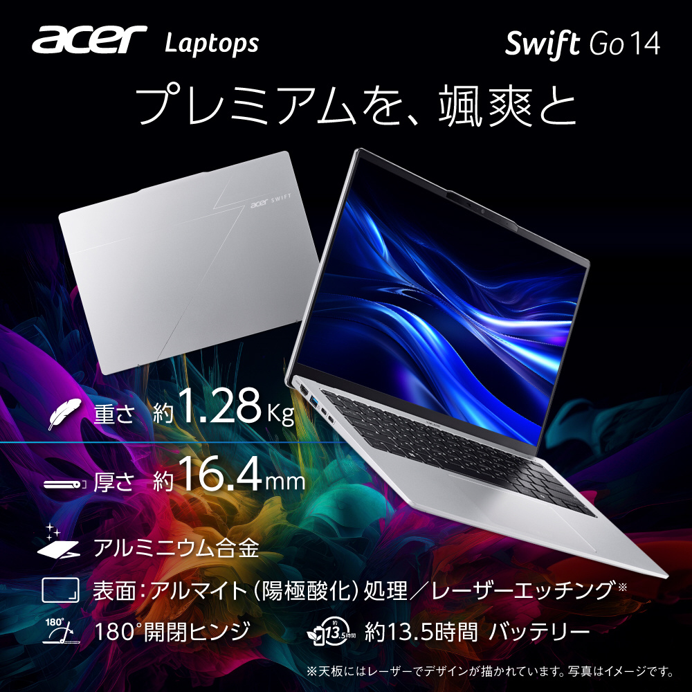 新しいSwift Go 14は、堅牢性、放熱性に優れたアルミニウムを纏い、最小高さ 約9.6mm(高さ約16.4mm)、重さわずか1.28Kgのボディに約13.5時間の長時間バッテリーを備えました。表面にはアルマイト(陽極酸化)処理を施し、高精度なレーザーエッチングによって新型Swiftの“スピード”が象徴的に描かれています。ミニマルでありながらプレミアムな佇まいを放ちつつ、洗練された印象に仕上げました。片手でラクに広げられる180°開閉ヒンジは薄型軽量ボディにふさわしく、颯爽と持ち出して趣味、仕事をこなす最適なパートナーとなることでしょう。