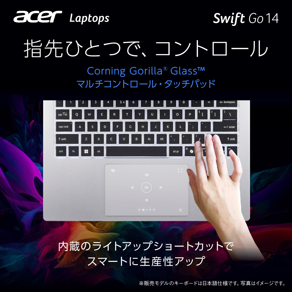 マルチコントロール・タッチパッドは、なめらかなCorning GorillaR Glass?を採用し、タッチパッドに内蔵されたライトアップショートカットで音楽やビデオ、通話操作が直感的に行えます。光るSwiftロゴを左から右にスワイプすると再生や音量調整などのショートカット、さらにスワイプするとビデオ通話に便利なショートカットに切り替えます。かんたんスマートな操作で生産性が格段に向上する魔法のパッドです。