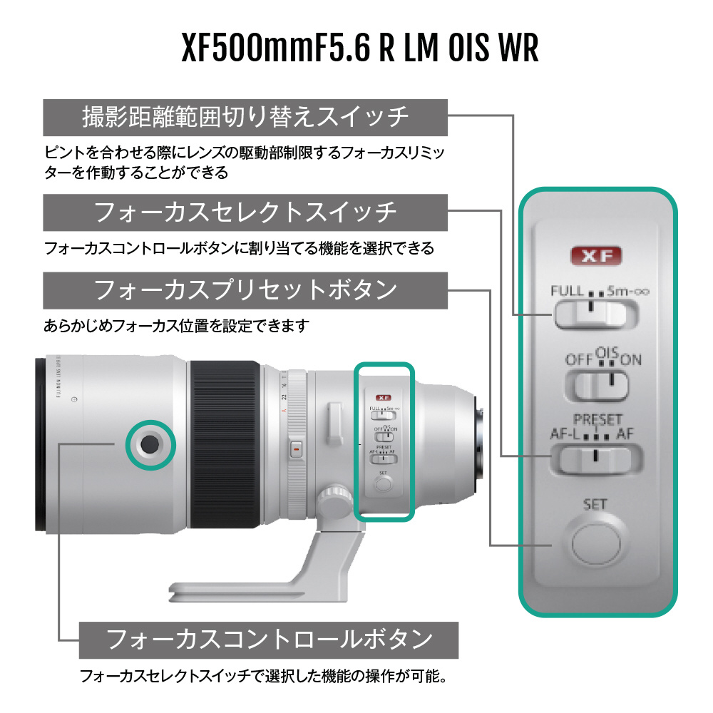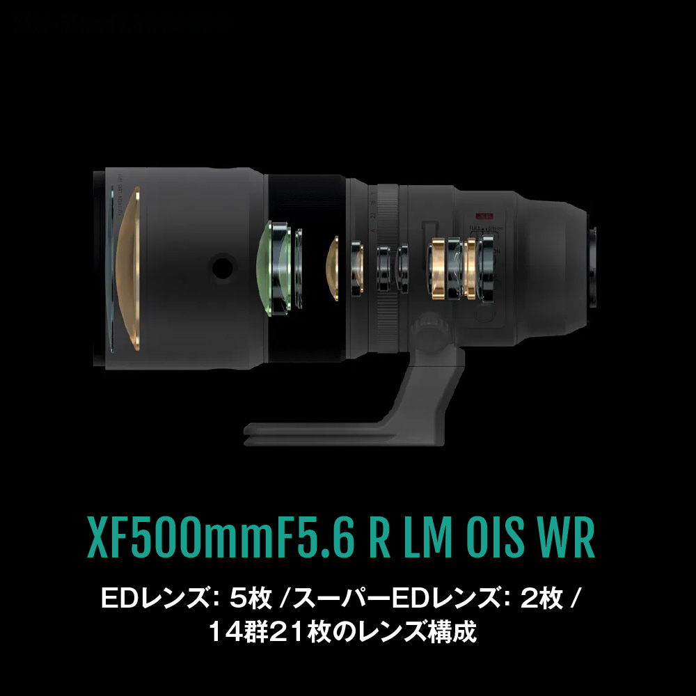 ・「XFレンズ」の単焦点ラインアップで最長(2024年10月14日時点)となる超望遠500mm(35mm判換算:762mm相当)の焦点距離とF5.6の明るさを実現。スポーツ撮影のほか、野鳥や野性動物、航空機の撮影で活躍します。