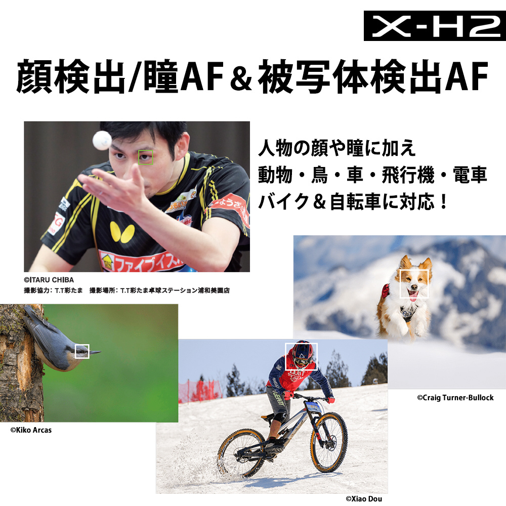 ・イメージセンサーの高画素化により位相差画素の数が増加したことで、動物の毛や細かい葉っぱなどの高周波な被写体に対してAF-Sの合焦精度が向上。風景撮影やポートレート撮影などで、より正確なピント合わせが可能です。また、動体撮影に最適な「X-H2S」と同じAFの予測アルゴリズムを採用し、AF-C使用中も安定したフォーカシングを実現します。