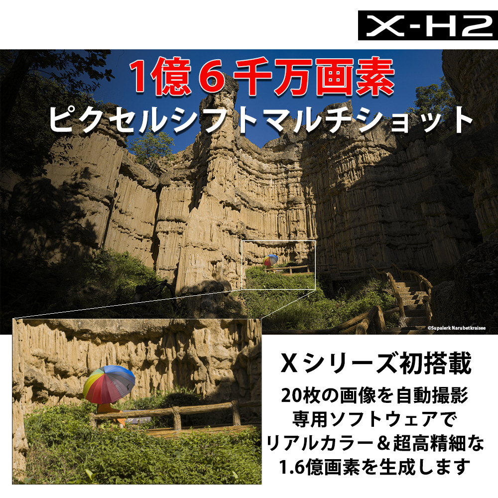 ・4倍の解像力と忠実な色再現による撮影が可能な「ピクセルシフトマルチショット」を「Xシリーズ」として初めて搭載しました。ボディ内手ブレ補正機能によりイメージセンサーを超高精度にシフトさせ自動撮影を行うことで、1回のシャッターで20枚の画像を取得。さらに専用ソフトウェア「Pixel Shift Combiner」を用いて、取得した画像を処理することにより、約1.6億画素の画像を生成できるため、コマーシャルフォトや文化財のデジタルアーカイブ用途に最適です。