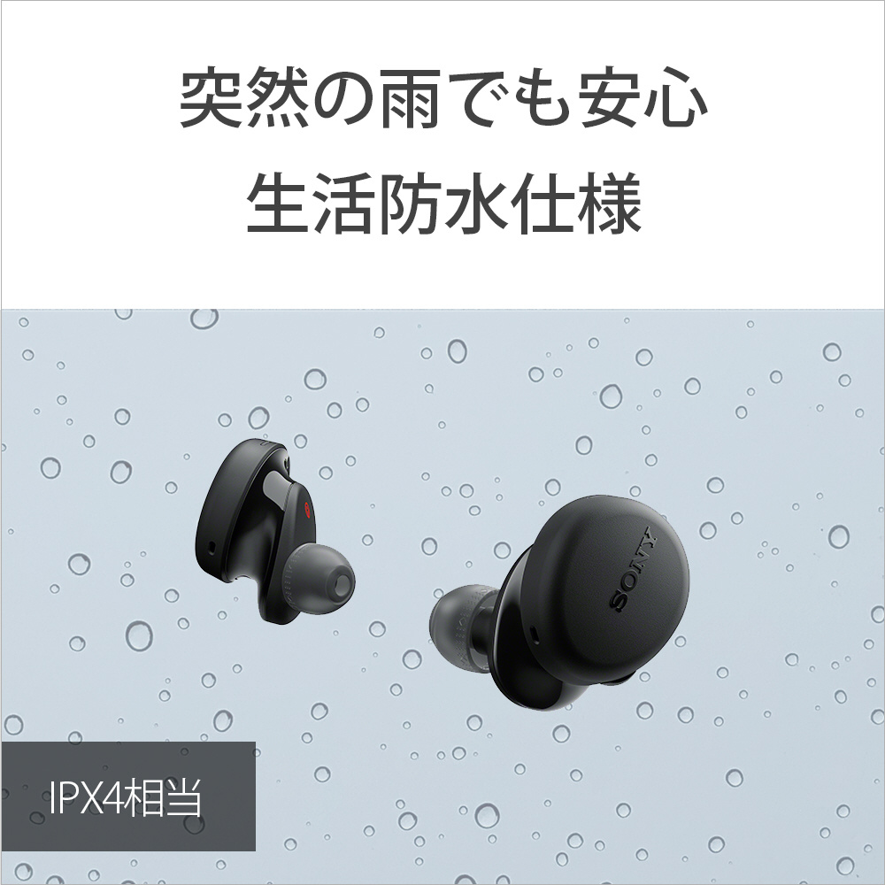 IPX4相当(*)の優れた生活防水により、外出中の突然の雨や、スポーツやダンスで汗をかいても安心して音楽を楽しめます。* ヘッドホン本体のみ対応。あらゆる方向からの飛沫に対して本体機能を保護するものです(ヘッドホン音導管(音出口の筒部)は除く)