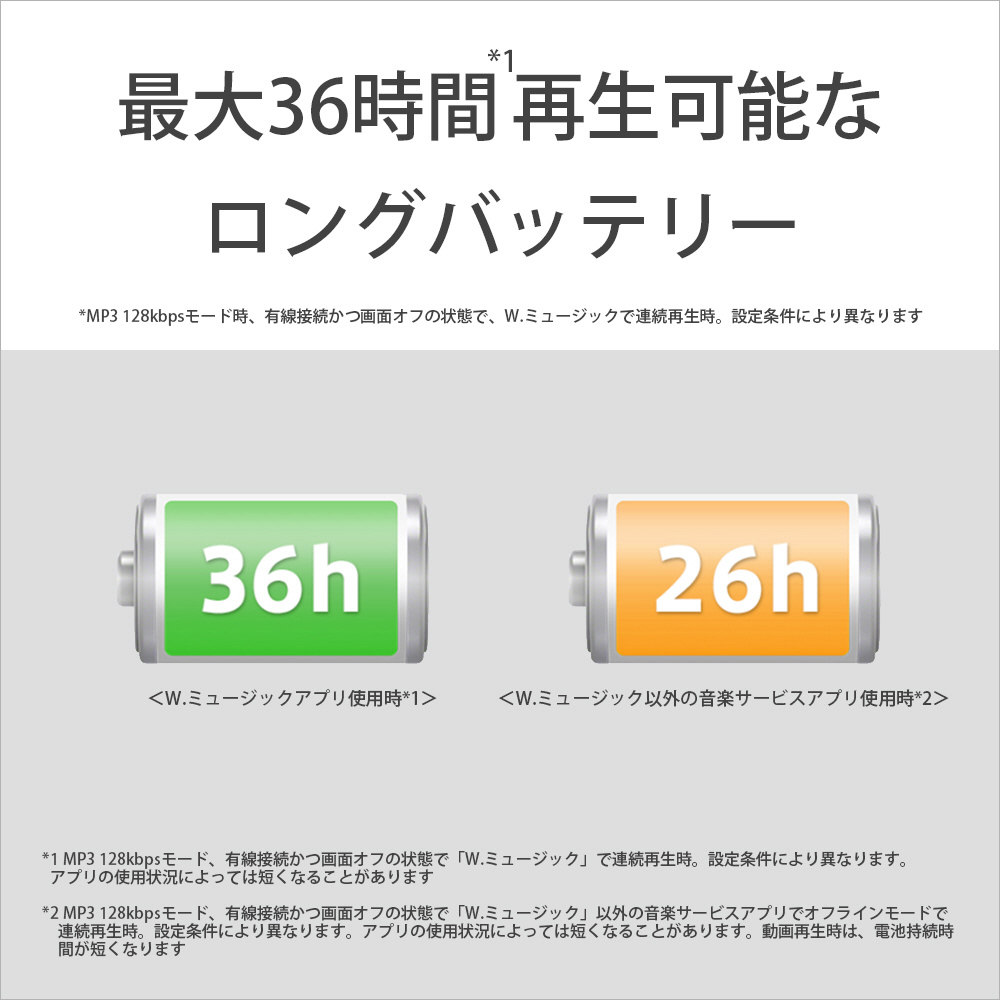 | バッテリー駆動時間 | ●MP3 128kbps 約36時間 ●FLAC 96kHz/24bit 約32時間 ●FLAC 192kHz/24bit 約32時間 ●DSD 2.8224MHz/1bit 約28時間 ●DSD 5.6448MHz/1bit 約22時間 ●DSD 11.2896MHz/1bit 約14時間 |