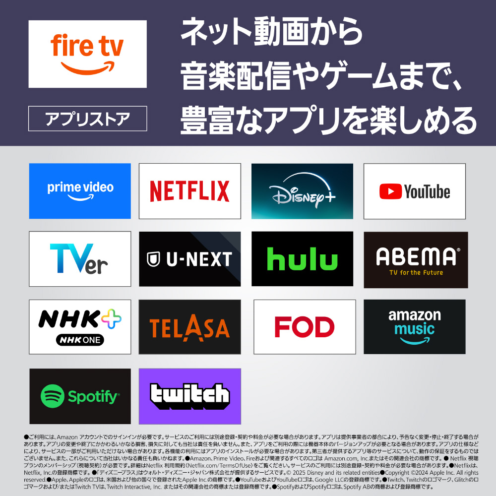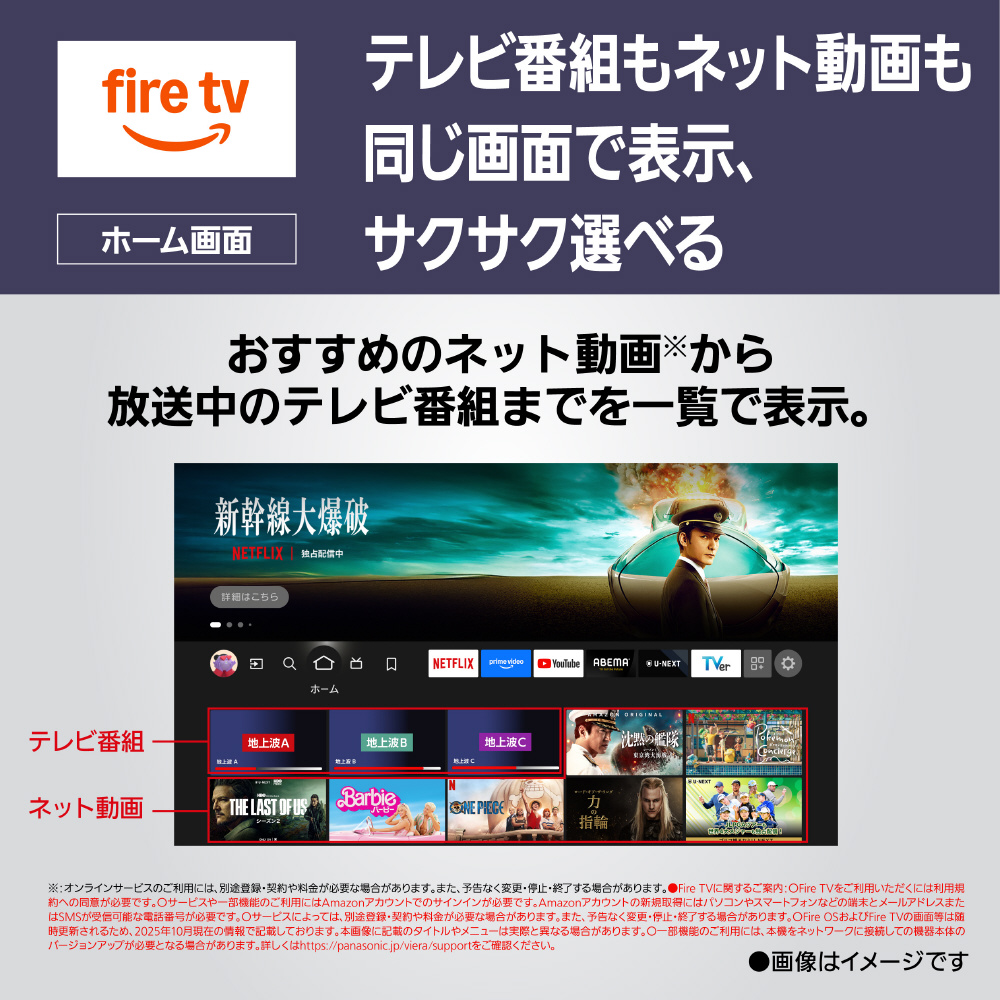 Fire TVの搭載により、放送中の番組とネット動画のコンテンツをホーム画面でシームレスに表示し直感的に選択することができます。また、Alexa対応機器(別売)との連携によるスマートホーム機能を実現しています。※●Fire TVに関するご案内:〇Fire TVをご利用いただくには利用規約への同意が必要です。〇サービスや一部機能のご利用にはAmazonアカウントでのサインインが必要です。Amazonアカウントの新規取得にはパソコンやスマートフォンなどの端末とメールアドレスまたはSMSが受信可能な電話番号が必要です。〇サービスによっては、別途登録・契約や料金が必要な場合があります。また、予告なく変更・停止・終了する場合があります。〇Fire OSおよびFire TVの画面等は随時更新されるため、2025年10月現在の情報で記載しております。本サイトに記載のタイトルやメニューは実際と異なる場合があります。〇一部機能の利用には、本機をネットワークに接続しての機器本体のバージョンアップが必要となる場合があります。詳しくはhttps://panasonic.jp/viera/supportをご確認ください。オンラインサービスのご利用には、別途登録・契約や料金が必要な場合があります。また、予告なく変更・停止・終了する場合があります。
