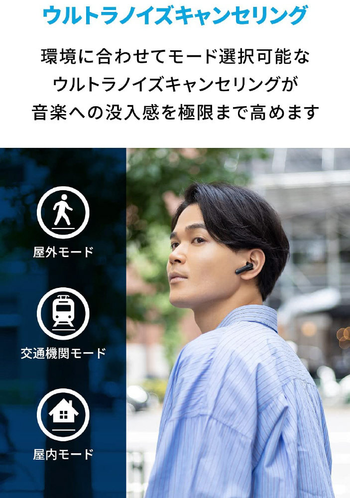 Soundcore Life P3は、ノイズリダクション機能を搭載した6つのマイク(各イヤホンに3つ)により、WEB会議や電話の相手にあなたの音声をよりクリアに伝えます。※イヤホンを下記環境で使用した場合、途切れや音飛びの原因となるためご注意ください。・地下道や駅構内などのWi-Fiルーターが密集する場所での使用・満員電車など人やBluetooth機器が密集する場所での使用・金属や電波遮断素材が使用されたバッグやスマートフォンケースの使用