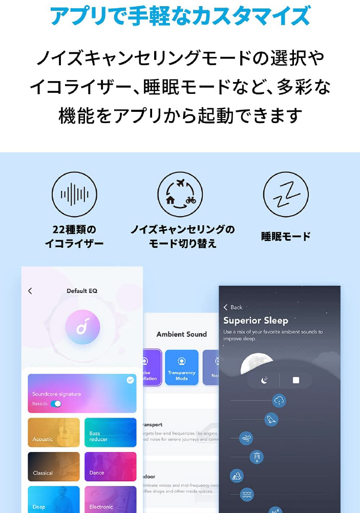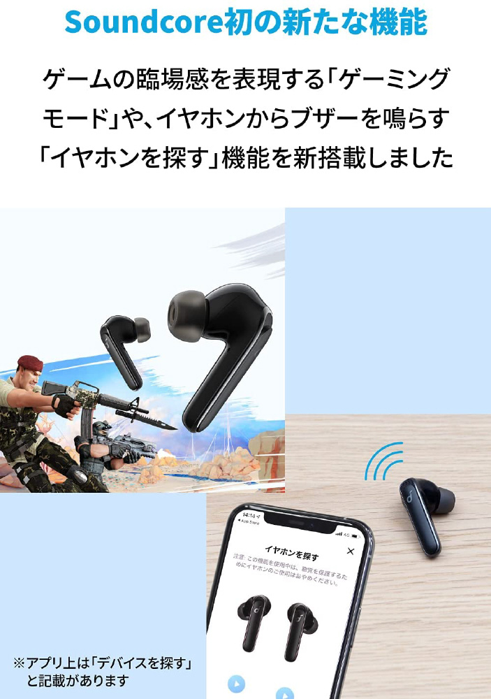 Soundcoreアプリ上で、ノイズキャンセリングモードの選択やイコライザー設定をカスタマイズすることができます。またゲームプレイ時に臨場感あるサウンドを楽しめる「ゲーミングモード」に加え、部屋の中でイヤホンを見失ってしまった際にBluetoothの接続可能範囲にイヤホンがあれば、アプリからイヤホンの音を鳴らして場所を知らせる「イヤホンを探す」等の新機能にも対応しています。(※PC接続時はSoundcoreアプリおよびゲーミングモード等のアプリ機能は利用できません)