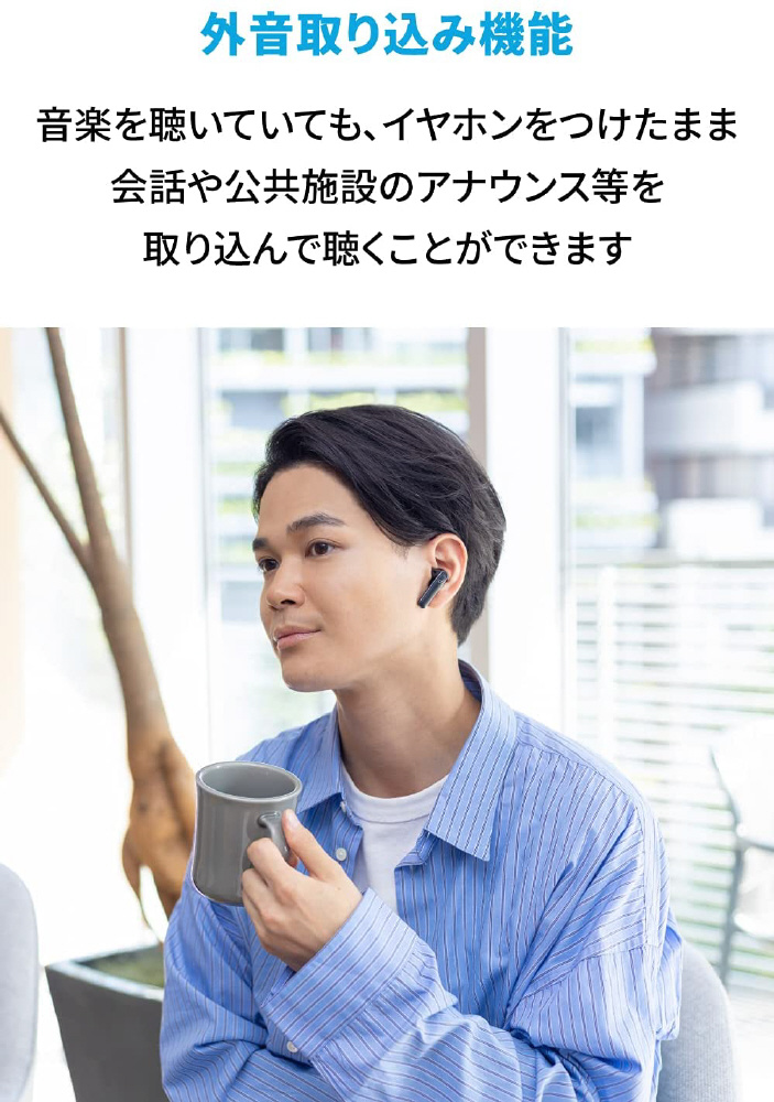 重さ:約60g(充電ケース含む) / 約5.2g(イヤホン本体 片耳)、防水規格:IPX5、通信方式:Bluetooth 5.2 / Bluetoothプロファイル:A2DP, AVRCP, HFP, HSP、対応コーデック:SBC / AAC、充電端子:USB Type-C / 充電時間:約3時間(充電ケース *USBケーブル使用時) / 約3時間(充電ケース *ワイヤレス充電器使用時)、再生可能時間:通常モード:最大10時間(イヤホン本体のみ) / 最大50時間(充電ケース使用時)、ノイズキャンセリングモード:最大8時間(イヤホン本体のみ) / 最大40時間(充電ケース使用時)、外音取り込みモード:最大8時間(イヤホン本体のみ) / 最大40時間(充電ケース使用時) ※再生可能時間は音楽再生時の時間であり、音量、再生する内容、使用環境によって異なります。