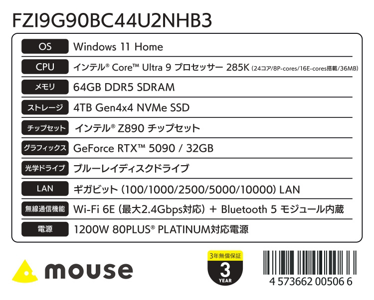 mouse(マウスコンピュータ) FZI9G90BC44U2NHB3 ゲーミングデスクトップパソコン G TUNE(TX 5090) [モニター無し /Windows11 Home /intel Core Ultra 9 /メモリ:64GB /SSD:4TB /無し]