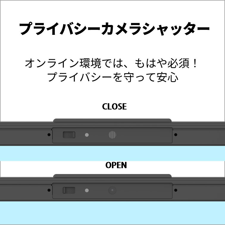 物理的にWebカメラのレンズを隠せる、プライバシーカメラシャッター搭載。動画やWeb視聴時、パソコンを使わない時には閉じておけば安心です。
