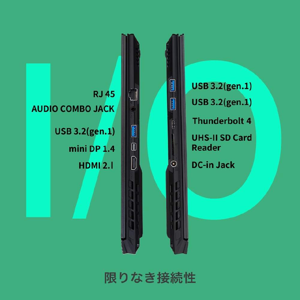 | インターフェイス | 3x USB 3.2 Gen1 (Type-A) 1x Thunderbolt 4 (Type-C) 1x HDMI 2.1 1x mini DP 1.4 1x 3.5mm Headphone/Microphone Combo Jack 1xフルサイズUHS-II SDカードリーダー 1x LAN ポート(RTL8125-BG REALTEK (2.5G) Ethernet) |