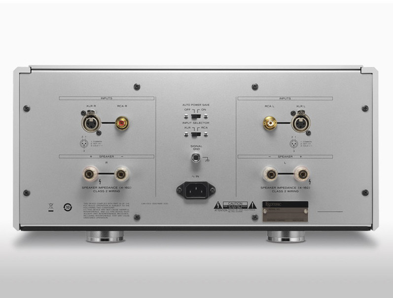 | 仕様1 | 定格出力:145W+145W(8Ω)、290W+290W(4Ω) 実用最大出力:580W+580W(2Ω) 周波数特性:5Hz~100kHz(+0dB、-3dB、8Ω) S/N比:115dB(IHF-A) 全高調波歪率:0.003%(1kHz、8Ω、145W) ゲイン:29dB ダンピングファクター:1000 入力端子:RCA×1系統、XLR×1系統 入力インピーダンス:RCA:22kΩ、XLR:44kΩ 電源:AC100V、50-60Hz 消費電力:440W(無信号時160W) |