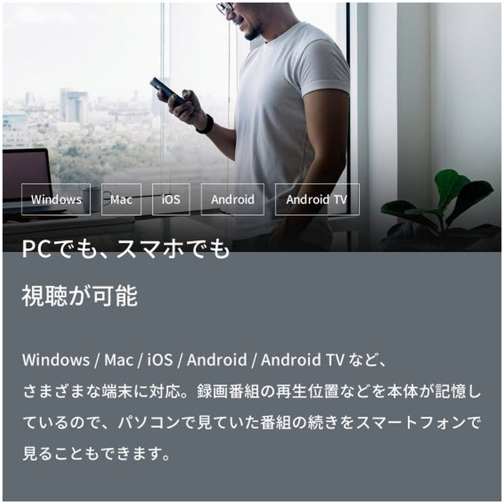 | 仕様3 | [外形寸法]約W35xD115xH123mm(突起部除く) [質量]約190g [消費電力]最大12W [電源]本体:DC 12V、ACアダプタ:AC 100V 50/60Hz [内容品]本体、ACアダプタ、LANケーブル、セットアップガイド(兼保証書)、mini B-CAS カード(使用許諾書添付) ※アンテナ線は付属していません [別途用意するもの]アンテナ線(市販のF型コネクタのケーブル)、高速インターネット、無線LANルーター |