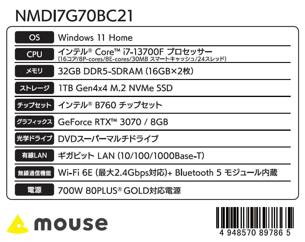 mouse(マウスコンピュータ) NMDI7G70BC21 ゲーミングデスクトップパソコン G-Tune [モニター無し /Windows11 Home /intel Core i7 /メモリ:32GB /SSD:1TB /無し]