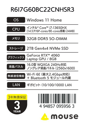 mouse(マウスコンピュータ) ノートパソコン DAIV クリエイター向け(RTX 4060) R6I7G60BC22CNHSR3 [16.0型 /Windows11 Home /intel Core i7 /メモリ:32GB /SSD:2TB /無し /日本語版キーボード]