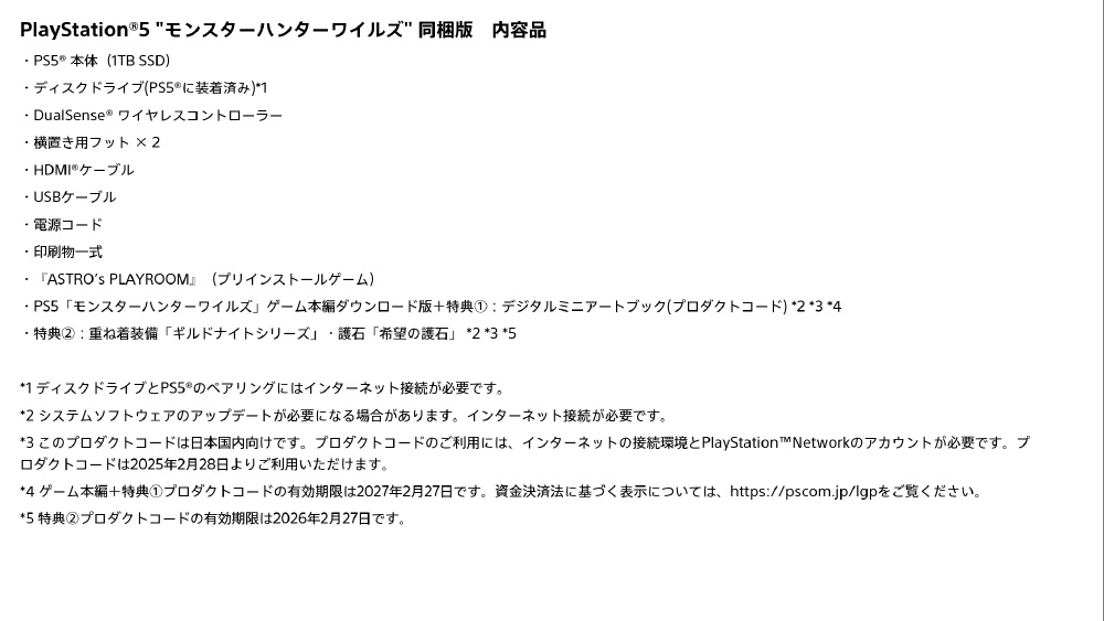 | 付属品 | ・PS5 本体(1TB SSD) ・ディスクドライブ(PS5に装着済み)*1 ・DualSense ワイヤレスコントローラー ・横置き用フット × 2 ・HDMIケーブル ・USBケーブル ・電源コード ・印刷物一式 ・『ASTRO’s PLAYROOM』(プリインストールゲーム) ・PS5「モンスターハンターワイルズ」ゲーム本編ダウンロード版+特典:デジタルミニアートブック(プロダクトコード) *2 *3 *4 ・特典:重ね着装備「ギル |