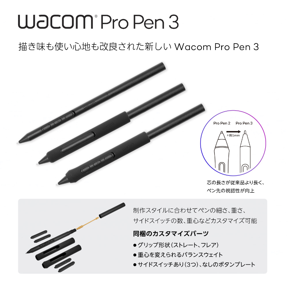 | 付属品 | ・Wacom Pro Pen 3 ・Wacom Pro Pen 3ペントレイ (標準芯5本、フェルト芯5本、芯抜き、ペンカスタマイズパーツ*付属)。 ・USB-C - USB-Cケーブル(1.8m) ・USB Type-C - USB-A変換ケーブル(1.8m) ・HDMI ケーブル(1.8m) ・Mini DisplayPort to DisplayPortケーブル ・ACアダプタ ・電源ケーブル(1.0m) ・クイックスタートガイド |